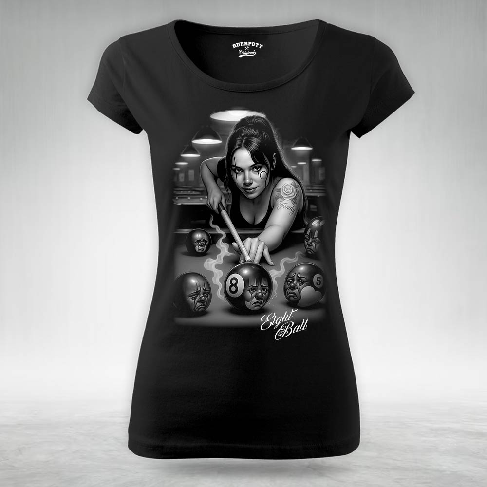 Das Eight Ball Damen T-Shirt bringt den coolen Billiard- und Streetstyle-Vibe direkt auf Stoff. Das Motiv zeigt eine Frau mit entschlossenem Blick am Billardtisch, bereit zum entscheidenden Stoß auf die schwarze Acht. Die Kugeln tragen ausdrucksstarke Gesichter, die dem Design eine unverwechselbare Chicano-Note geben.