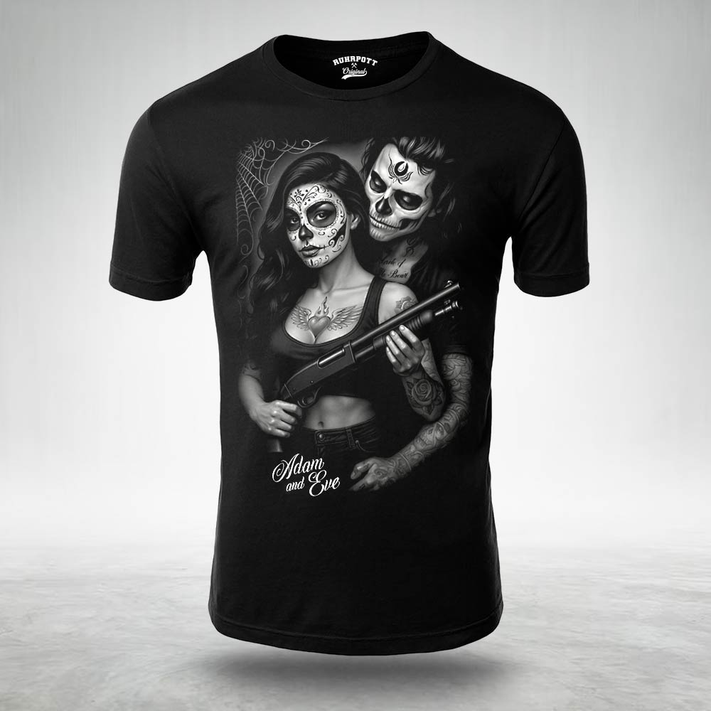 Das Adam and Eve Männer T-Shirt bringt düstere Romantik im typischen Chicano-Style auf Stoff. Das Motiv zeigt ein Paar im Sugar-Skull-Look: Sie mit entschlossenem Blick und Schrotflinte, er beschützend im Hintergrund. Eine moderne Interpretation von Adam und Eva, die Liebe, Gefahr und Loyalität vereint.