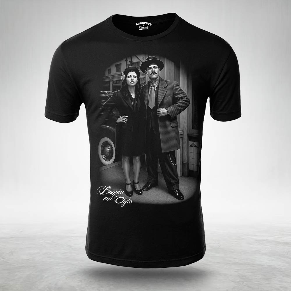 Schwarzes Männer-T-Shirt mit markantem Bonnie-und-Clyde-Motiv im Oldschool-Style. Die Illustration kombiniert klassische Gangster-Ästhetik mit Retro-Flair und kraftvollen Details.